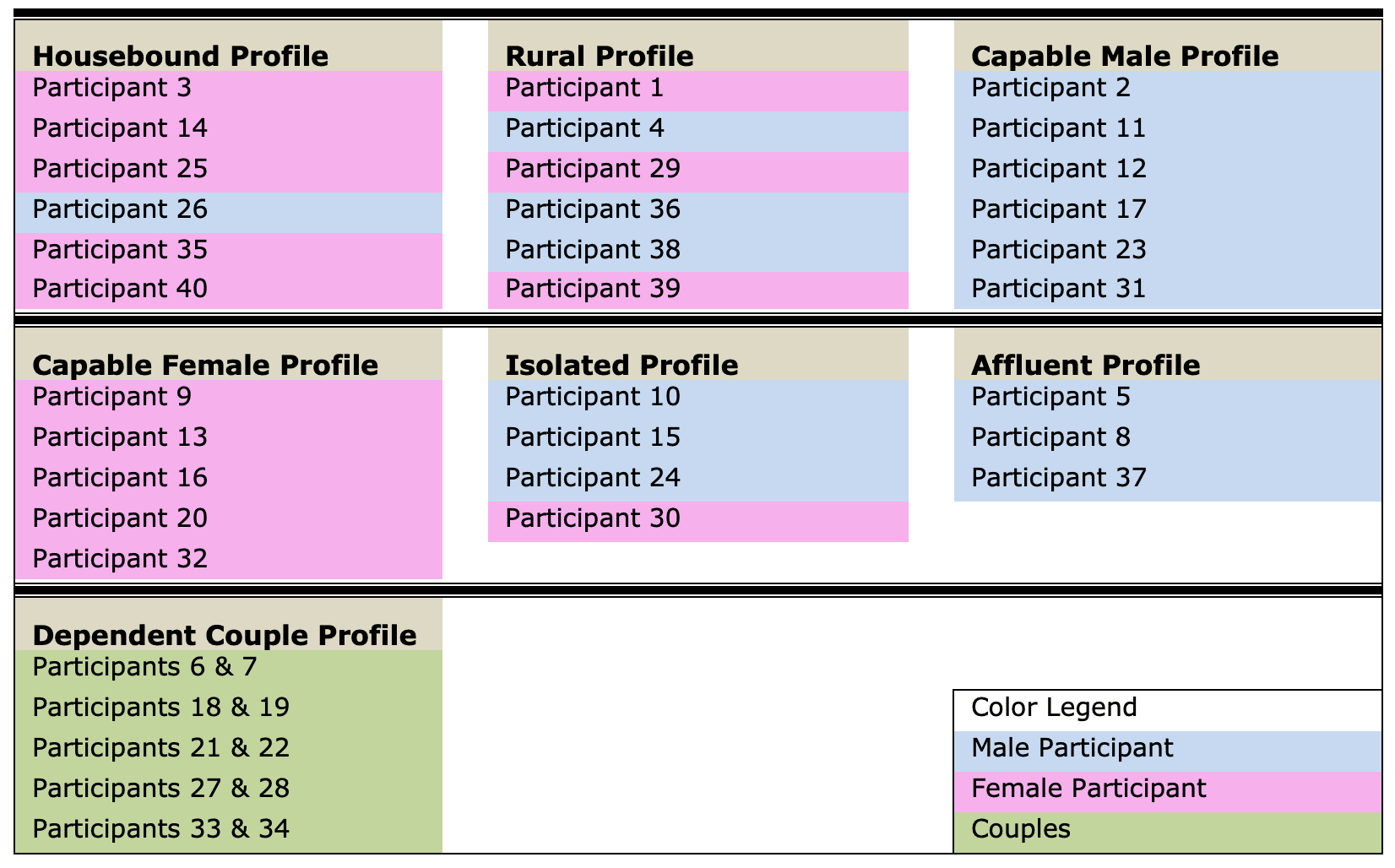 - Taxonomy #4: Housebound profile. Taxonomy characteristics are male or female participants displaying high levels of dependency on others. These participants remain indoors for long periods, display serious health concerns, and may be socially isolated.