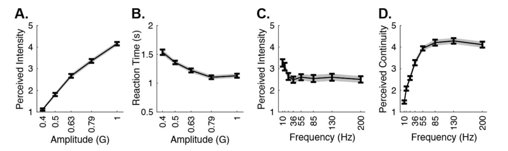 Figure 4. A. Average perceived intensity ratings for amplitude levels from 0.4 to 1G. Gray shaded areas show the standard error of the mean, as calculated by the standard deviation divided by the square root of the number of data points. B. Average reaction times for amplitude levels from 0.4 to 1G. C. Average perceived intensity ratings for frequency levels from 10 to 200 Hz. D. Average perceived continuity ratings for amplitude levels from 10 to 200 Hz.