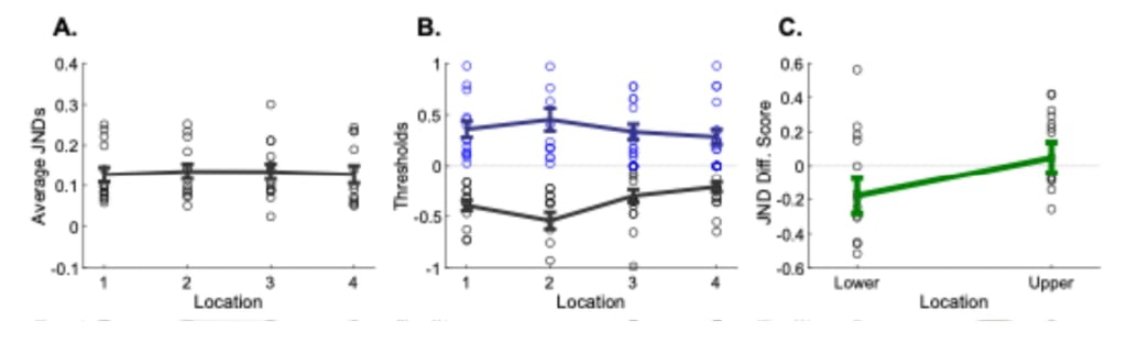 Figure 7. A. Average discrimination thresholds at every location. Circles show JNDs per participant at the forearm location. B. The discrimination thresholds split into detecting a decrement or an increment, the black line and blue line, respectively. Circles show JNDs per participant. C. JND difference scores for lower and upper parts of the forearm.