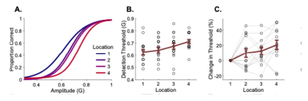 Figure 5. A. The fitted logistic curve on psychometric data indicates the accuracy of detection for all participants at 4 forearm locations (Table 2). B. Average detection thresholds of all participants at 4 forearm locations; scatter plot refers to participant data. Error bar represents the standard error of the mean (Table 6). C. Change in detection thresholds for each participant across forearm locations (Table 5).