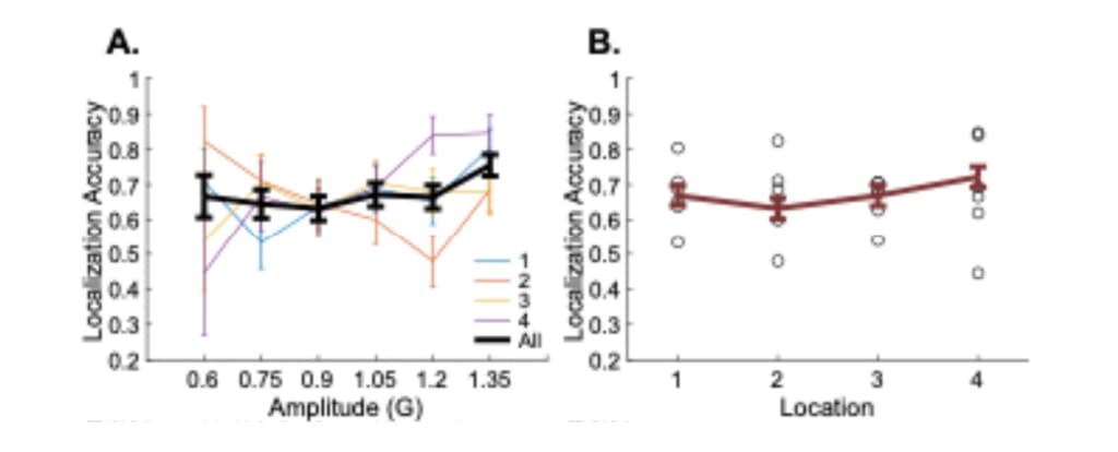 Figure 6. A. Localization accuracy across amplitude levels for forearm locations separately (colored lines) and their average in black line. B. Localization accuracy for forearm locations. The red line shows the average localization accuracy per location. Circles show the localization accuracy for different amplitude levels (Table 8).