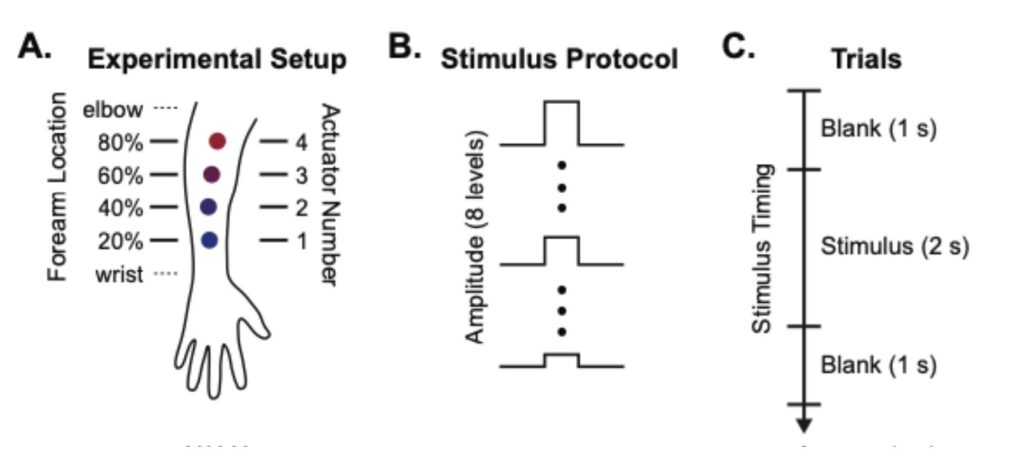 We explored vibrotactile sensitivity across 4 locations on the forearm by evenly placing 4 vibration motors along the dorsal surface (Figure 3A). In our study design, the distance between actuators was relative to the participant’s arm length, allowing us to test perceptual thresholds personalized to each participant’s forearm length.