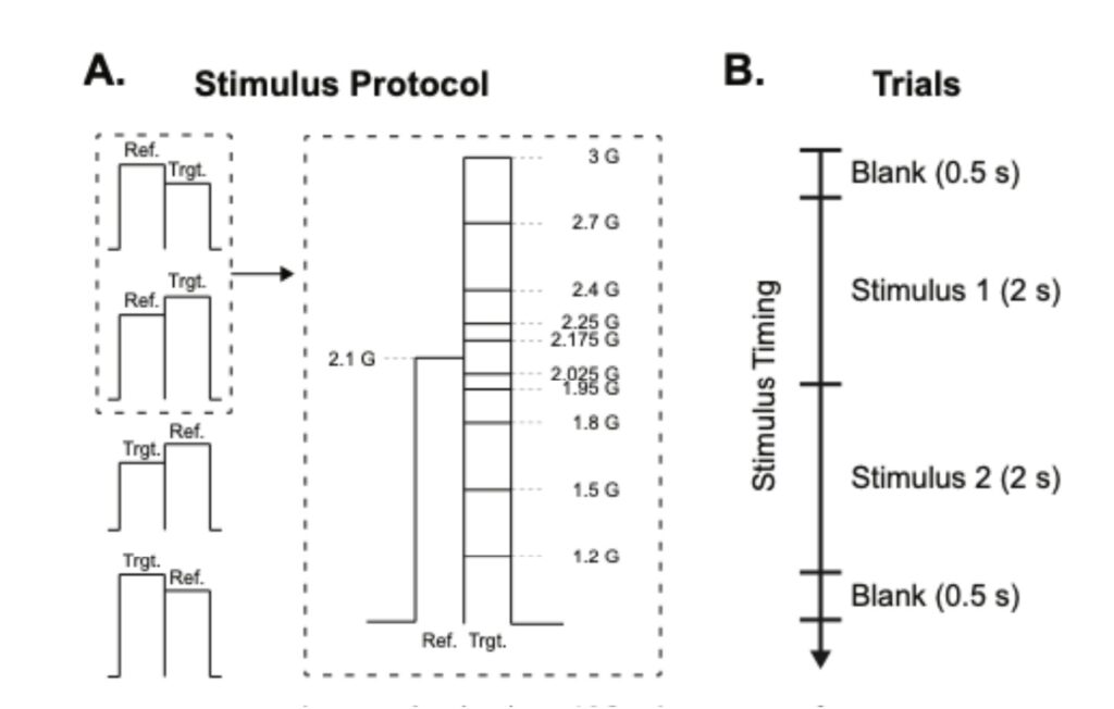 Figure 3. A. Vibrotactile stimuli consisted of a reference and a target vibration. The order of the stimuli was randomized; in half of the trials, the reference came first, whereas in the other half, the target came first. The reference was at a fixed amplitude, whereas the amplitude of the target was either a lower or higher amplitude. The dashed area on the left of the figure demonstrates the case in which the reference stimulus was sent first. The target stimulus was either lower or higher than the reference stimulus. The dashed area on the right of the figure shows the case in which a stimulus pair started with a reference and continued with the target. The reference vibration was 2.1 G throughout the experiment, whereas the target vibration was varied on 10 levels of amplitude, which is 5 levels in absolute difference to the reference. B. The trials started with a 0.5 s blank, followed by 2 s of either target or reference vibration, followed by the remaining stimulus type. After the stimulus, participants reported if the intensity increased or decreased within 4 s. The trial ended with a 0.5 s blank. The session included 4 forearm locations, and 10 amplitude differences for each location (5 increments and 5 decrements around the 2.1 G reference) with 4 repetitions, totaling 160 trials per participant.